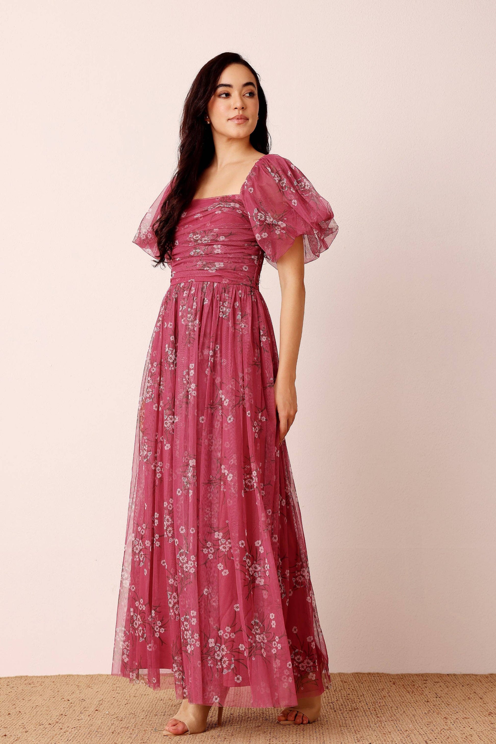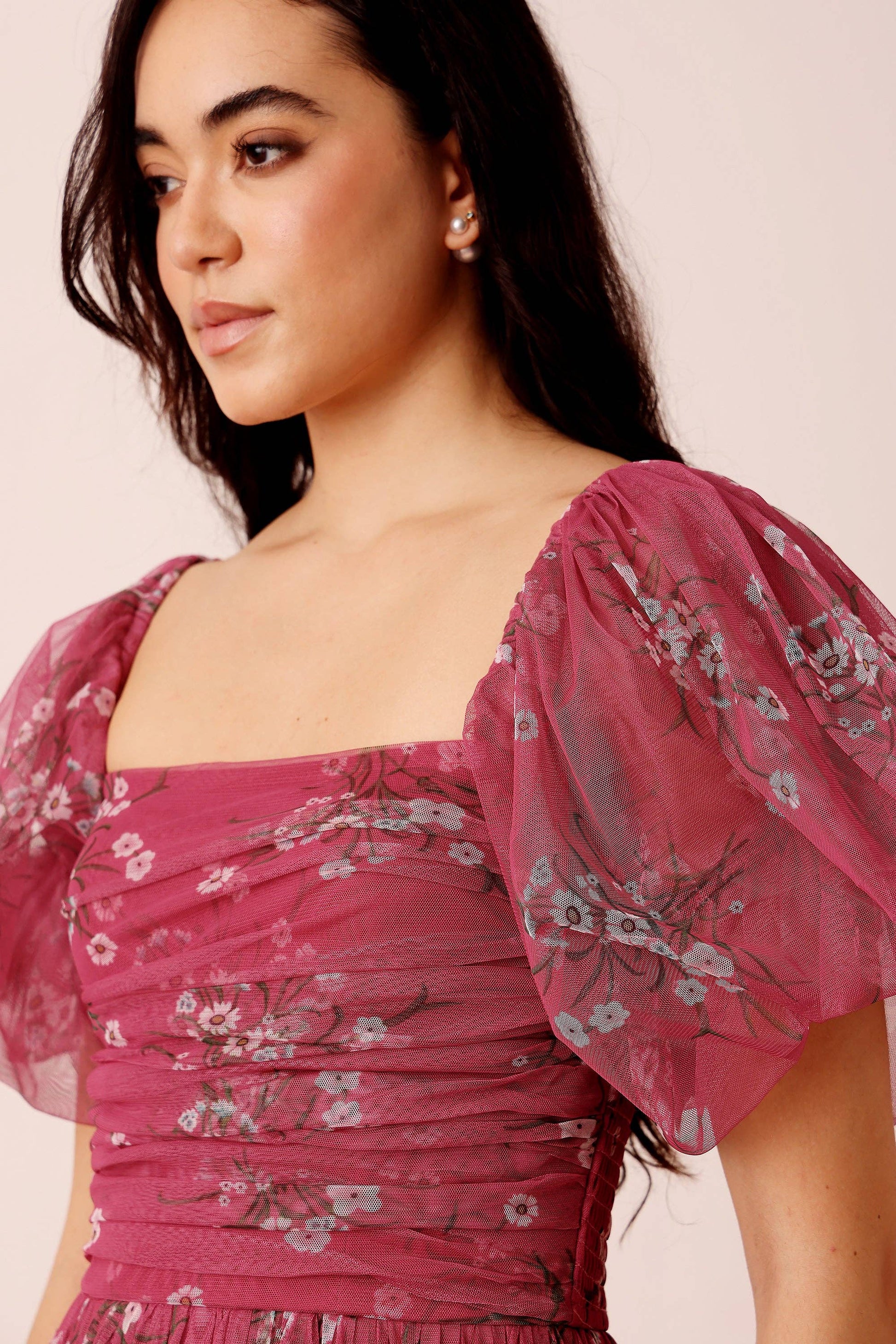 Lace & Beads Lana Puff Sleeve Tulle Maxi Dress in Orchid Floral. Ethereal and effortlessly feminine, the Lana Puff Sleeve Maxi Dress in Orchid Floral Tulle is made for sun-drenched celebrations and softly lit evenings. Crafted from weightless layers of sheer tulle, it features a delicate orchid-toned floral print that feels both romantic and painterly. The structured bodice is gently ruched to sculpt the waist, while voluminous puff sleeves and a smocked back offer comfort without compromising on silhouette. Falling into a full, gathered skirt that drifts with movement, Lana is a day-to-evening dream, perfect for garden weddings, al fresco dinners or any moment that calls for a little magic.
