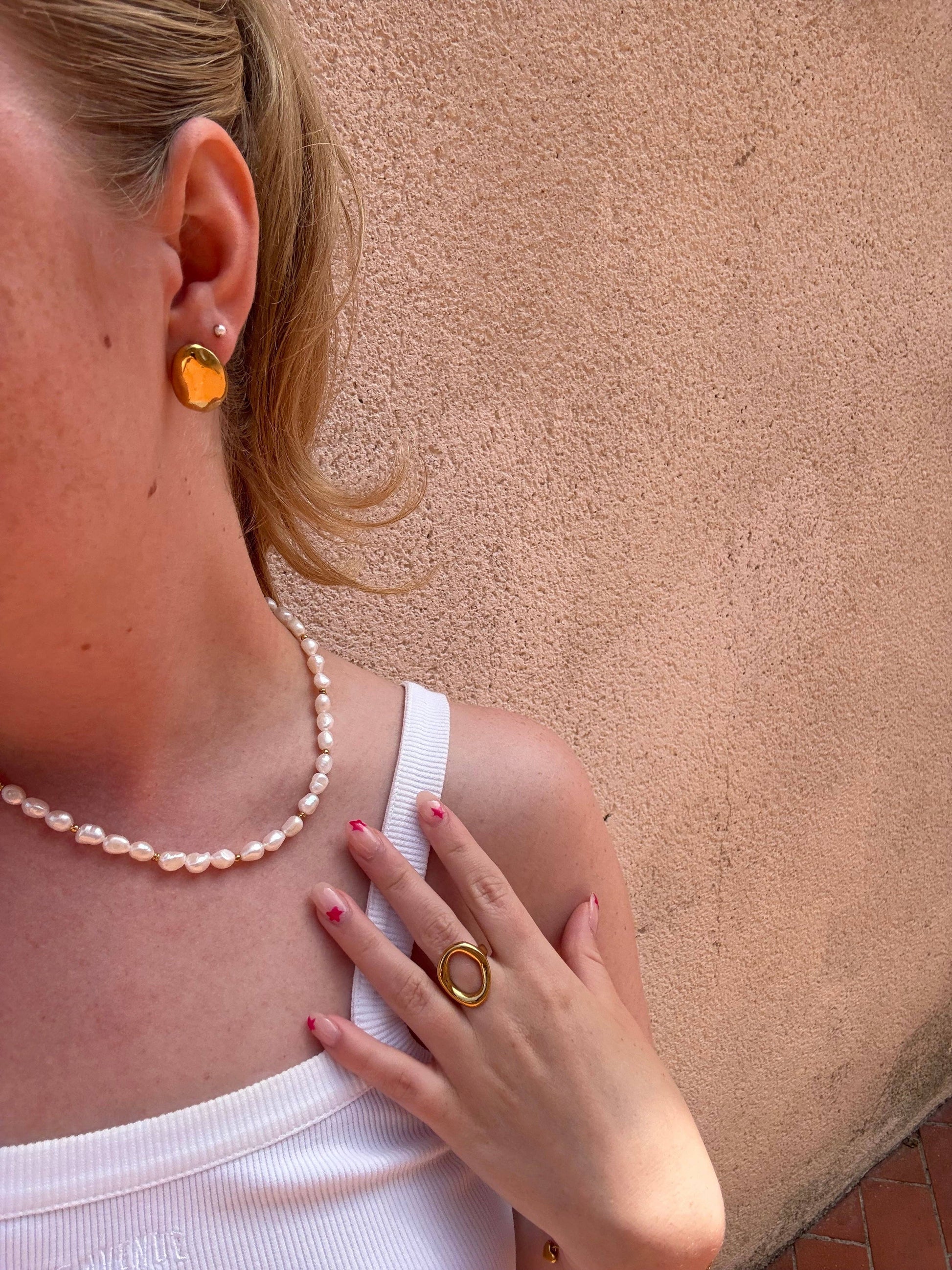 Say hello to the Oval studs earrings – your new favorite minimalist statement. Inspired by nature’s raw forms, these polished gold earrings feature an irregular, pebble-like shape that reflects the light beautifully. Lightweight and comfortable, they’re perfect for everyday wear but bold enough to stand out.