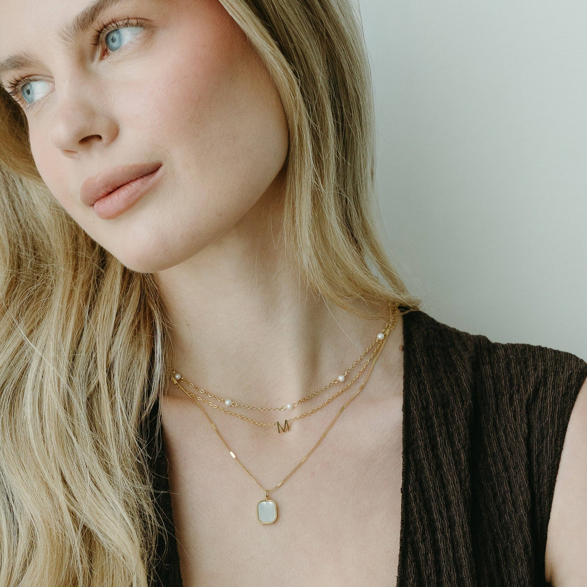 A luminous mother-of-pearl pendant framed in gold, suspended from a delicate textured chain. Its iridescent glow and modern silhouette make it a statement of effortless elegance and refinement.